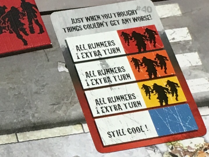 今回のチュートリアルプレイして思った事は、ゾンビと同じゾーンに仲間がいた場合、射撃武器でそのゾーンを攻撃すると仲間→ゾンビの順に攻撃が当たるルールが超厄介。