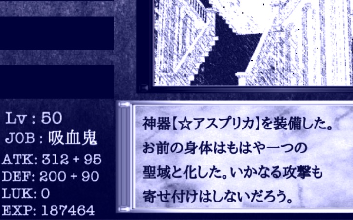 こちらもとんでも性能。神をも倒せるほどの力を手に入れ、レベルもMAXまで上げ、エリクサーもフルで、最後のダンジョンのボス「バハムート」を倒すと。。。この異世界の真実にたどり着く。